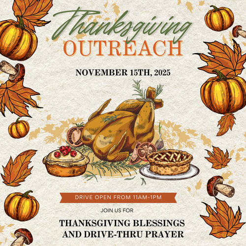 Join us on Saturday, November 15th for our Thanksgiving Outreach! You can serve by helping pack boxes, hand out meals, or assist families on-site. Every act of service makes a difference.